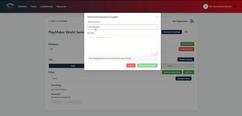 Handle score updates, communication, and schedule changes without chasing teams all weekend.